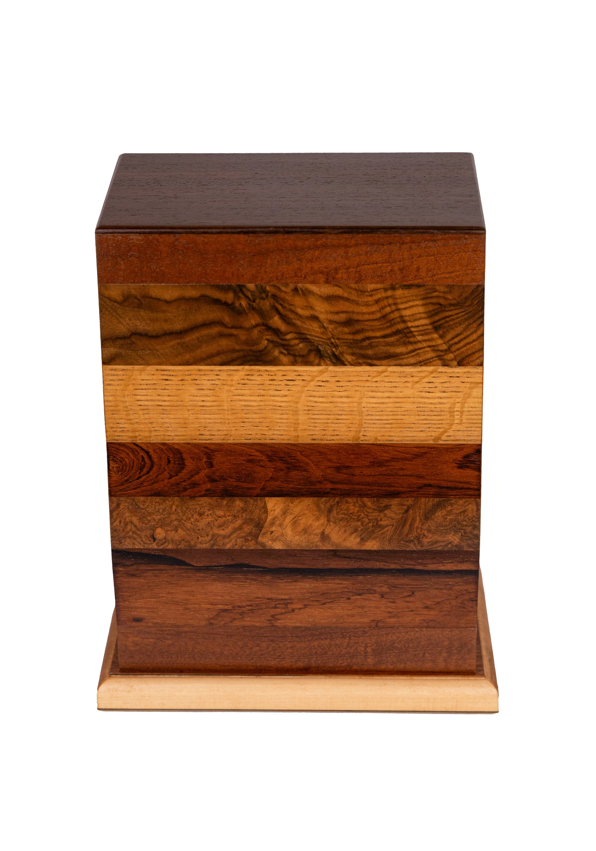 Handcrafted High Quality Multi-Wood Extra Large Urn for Human Ashes – Six Vintage Pianos English Walnut Burl, Rosewood & Oak